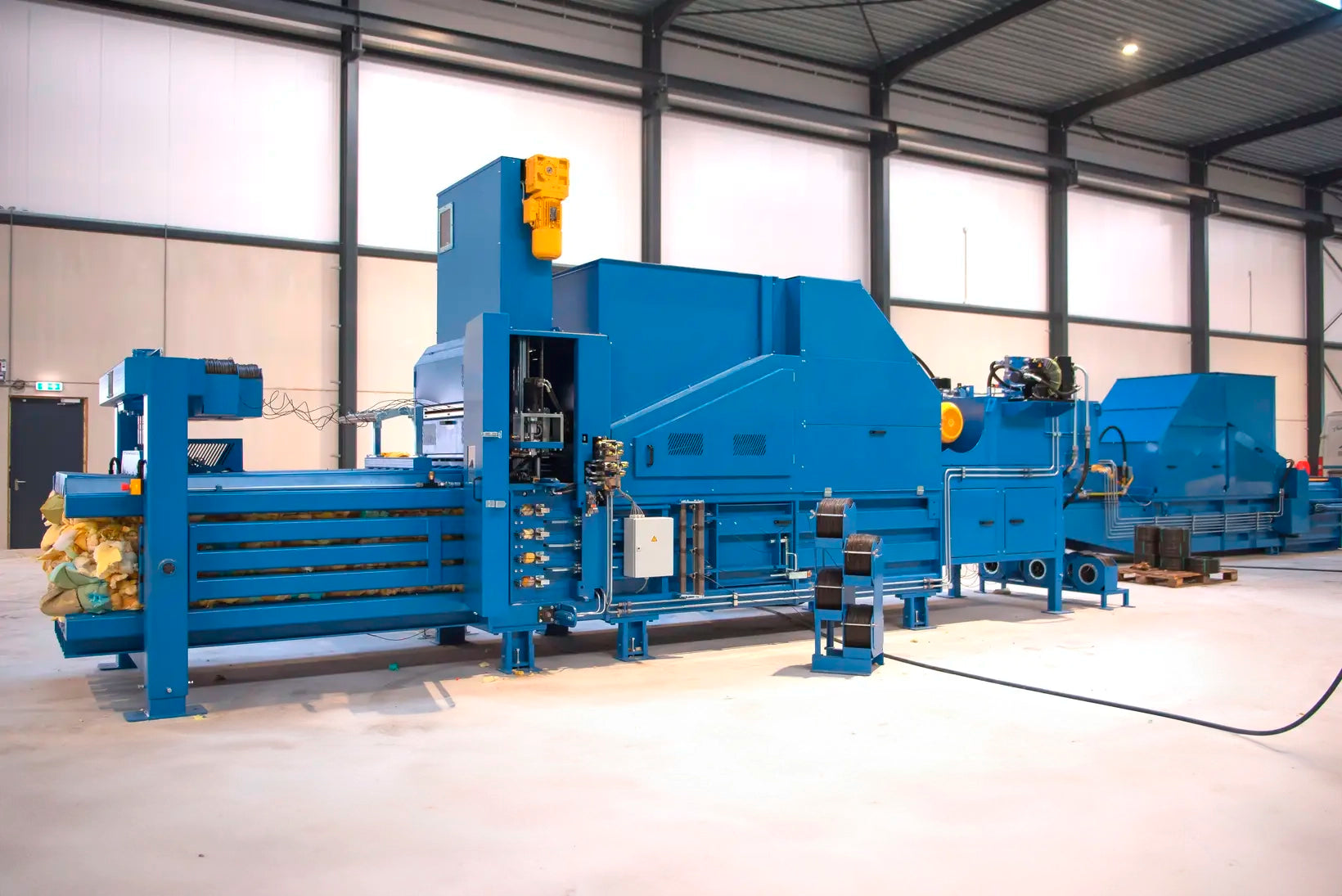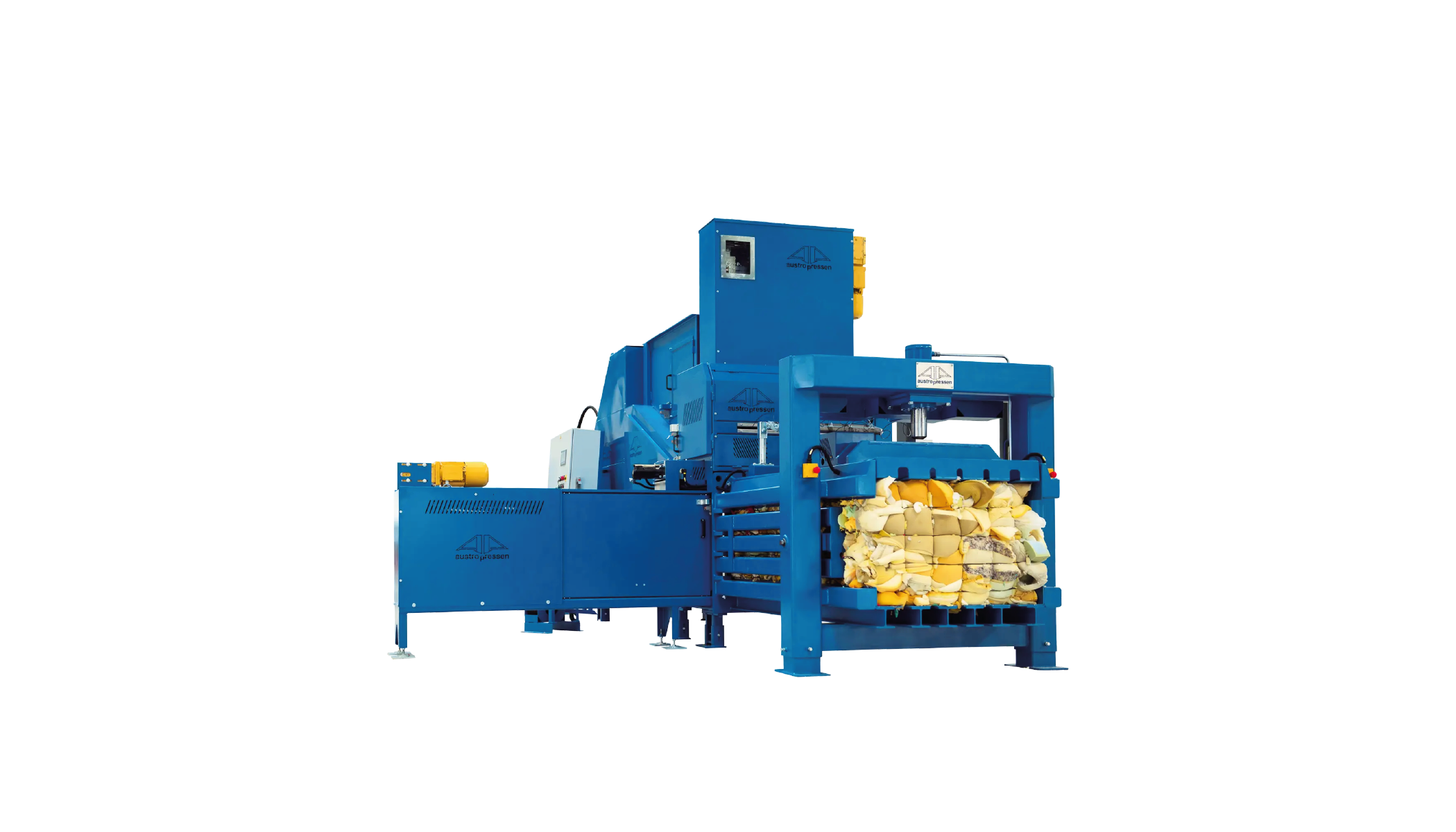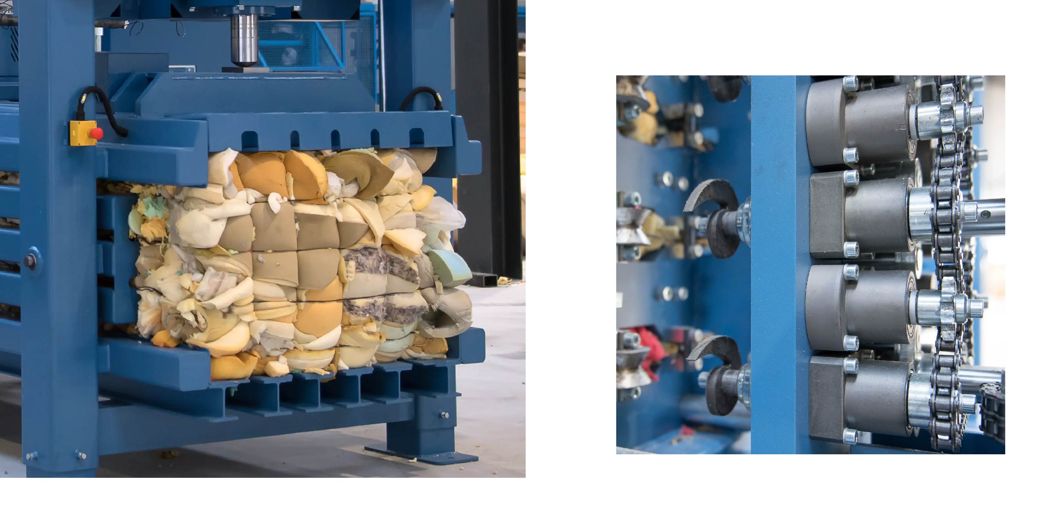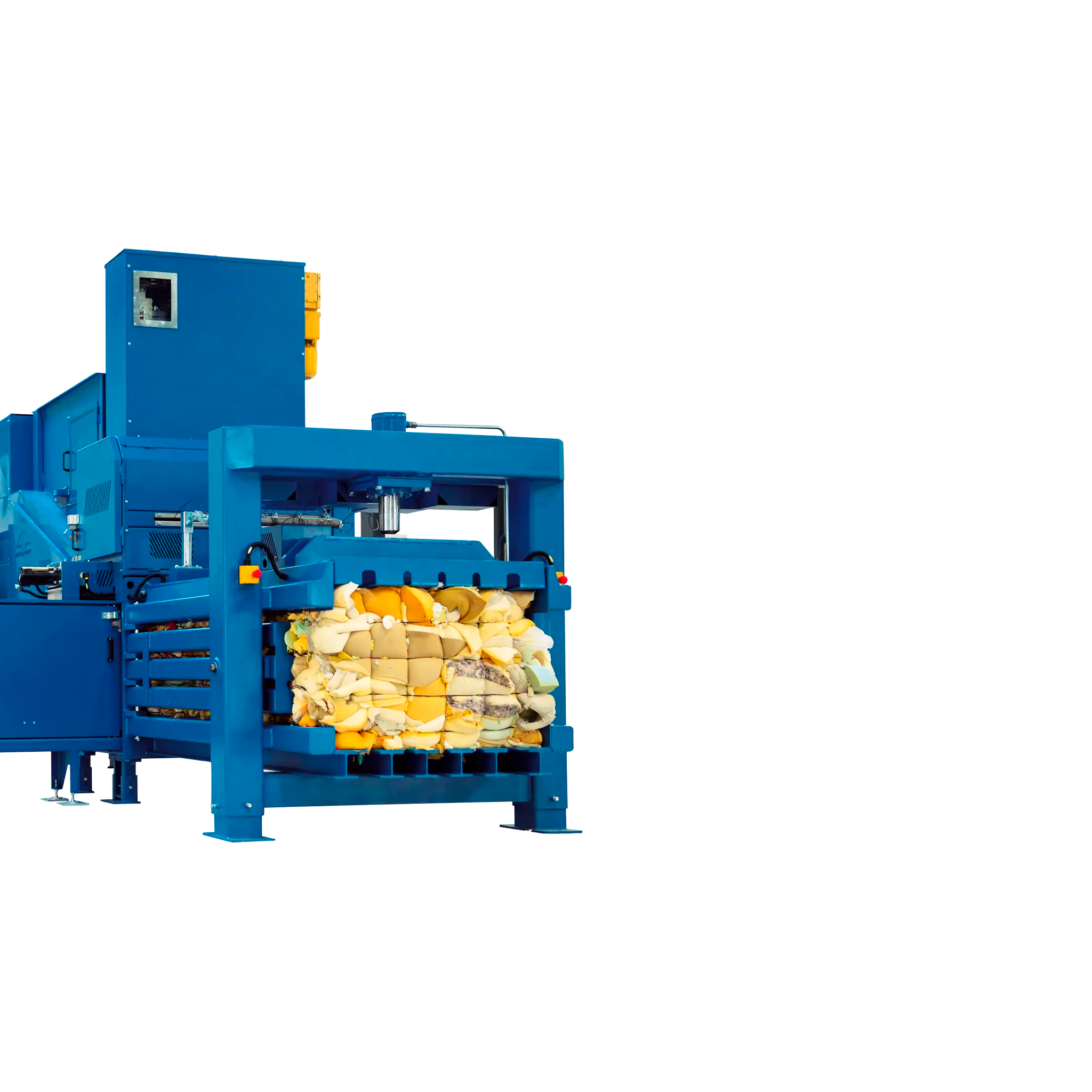 Prensa compactadora Heavy Duty de ciclo automático, fiable y fácil de manejar, capaz de producir balas de hasta 300 kg. Totalmente automatizada, es ideal para espuma y materiales expansivos. Incorpora sistema de atado automático Drillfix horizontal y vertical, garras de retención y control SPS, asegurando un funcionamiento continuo y sin fallos. Las balas resultantes ofrecen dimensiones óptimas para una carga eficiente en contenedores.