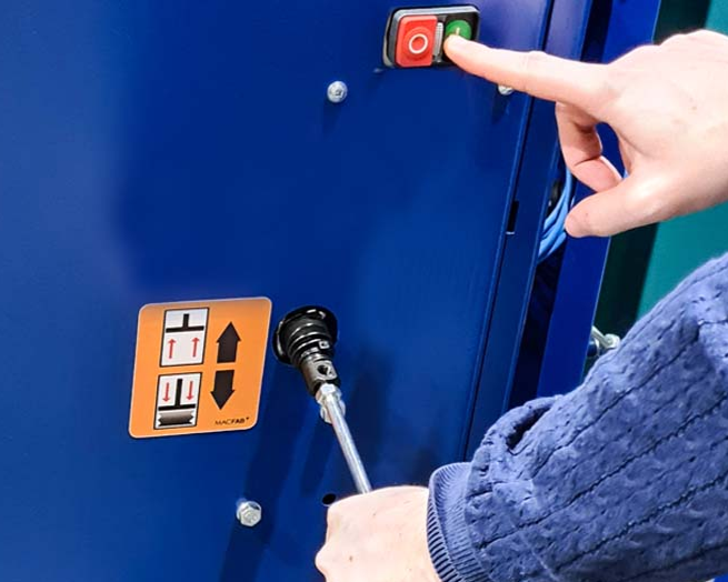 Sistema de operación con dos manos, evitando atrapamientos y accidentes.